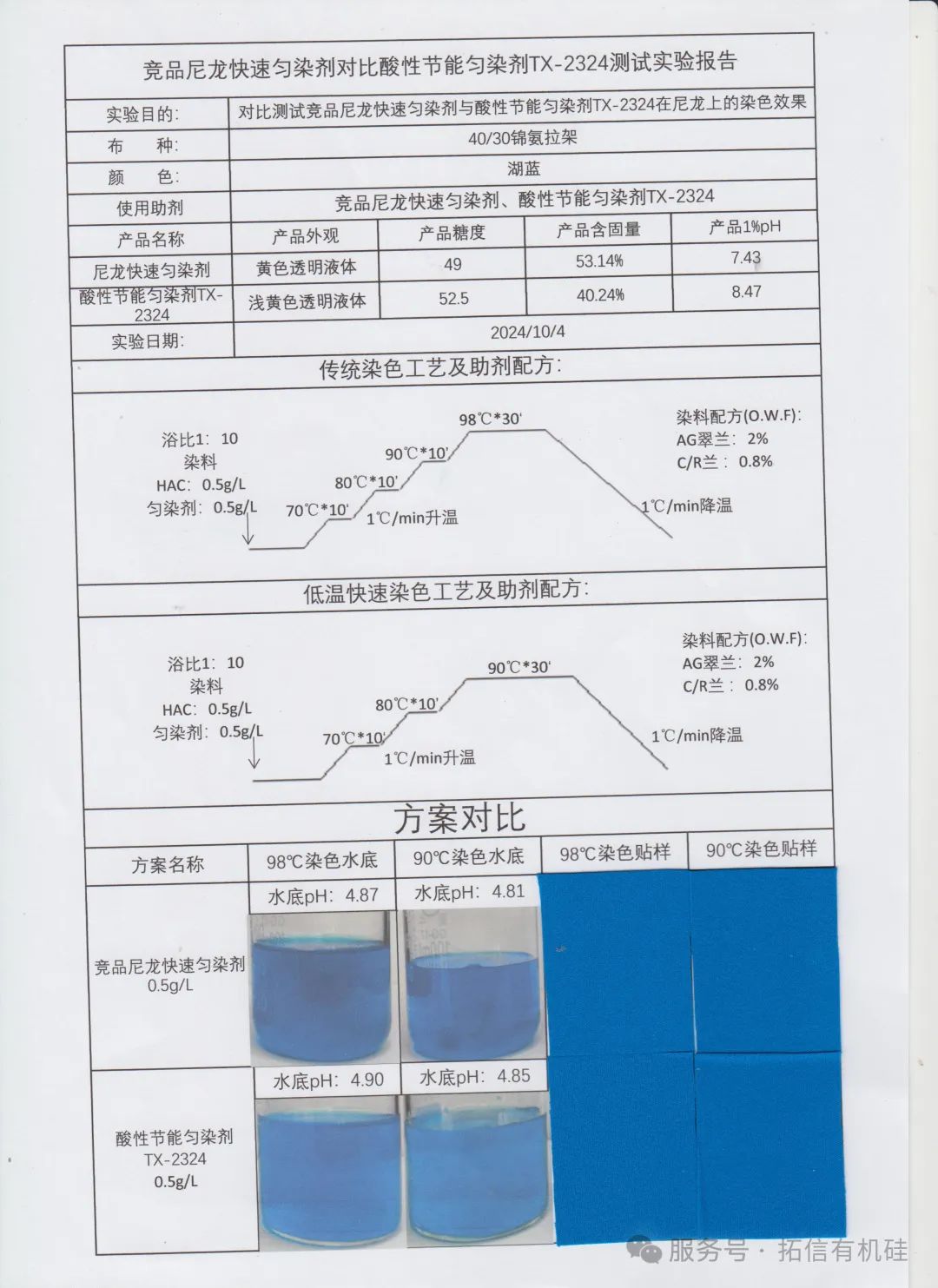 采用不同颜色的面料,测试【竞品尼龙匀染剂】与【拓信酸性节能匀染剂TX-2324】的使用效果。