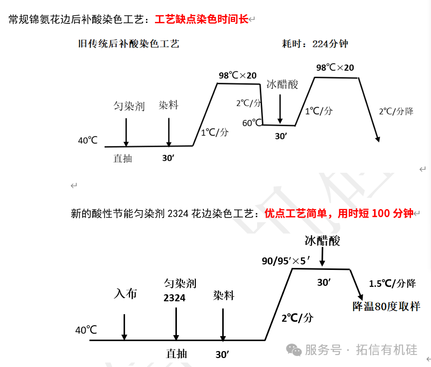 后补酸可以放在 90 或者 95 度直接补酸,补酸结束即保温结束,降温 80 度取样对色即可,染色温度 90、95 度都可以(不同客户选择染料不同温度也有差别),客户可以根据需要自行选择合适的温度, 此产品使染色工艺大大缩短,节约时间,增加产能,是染尼龙和花边染色理想的降本增效产品。