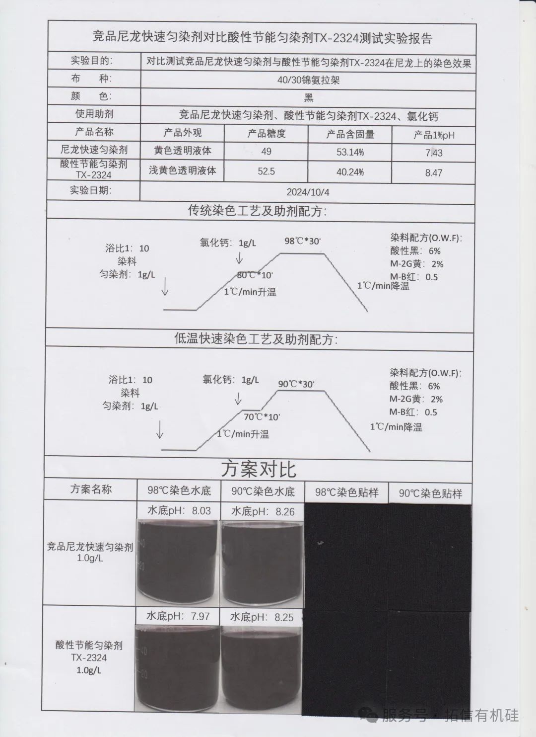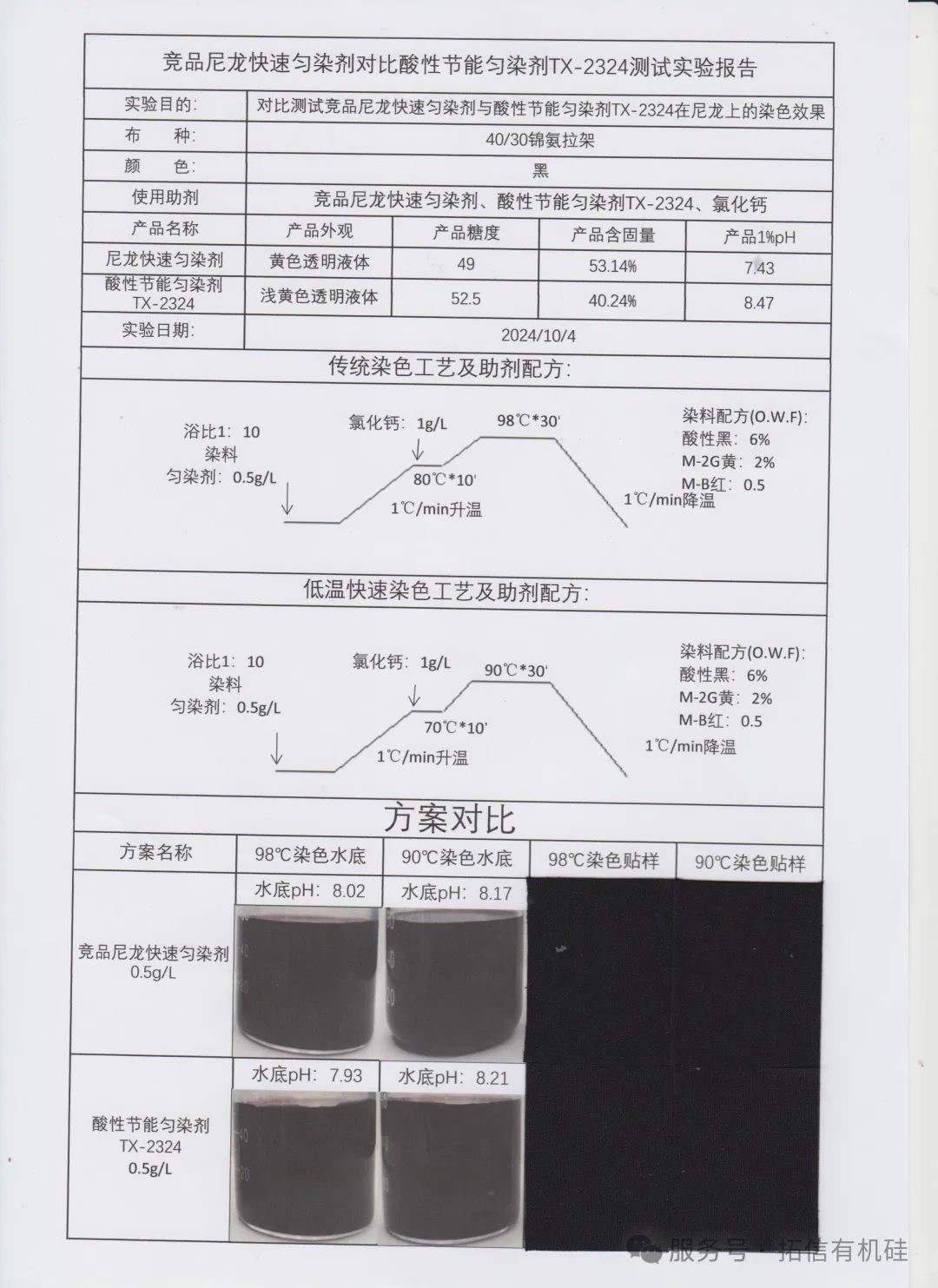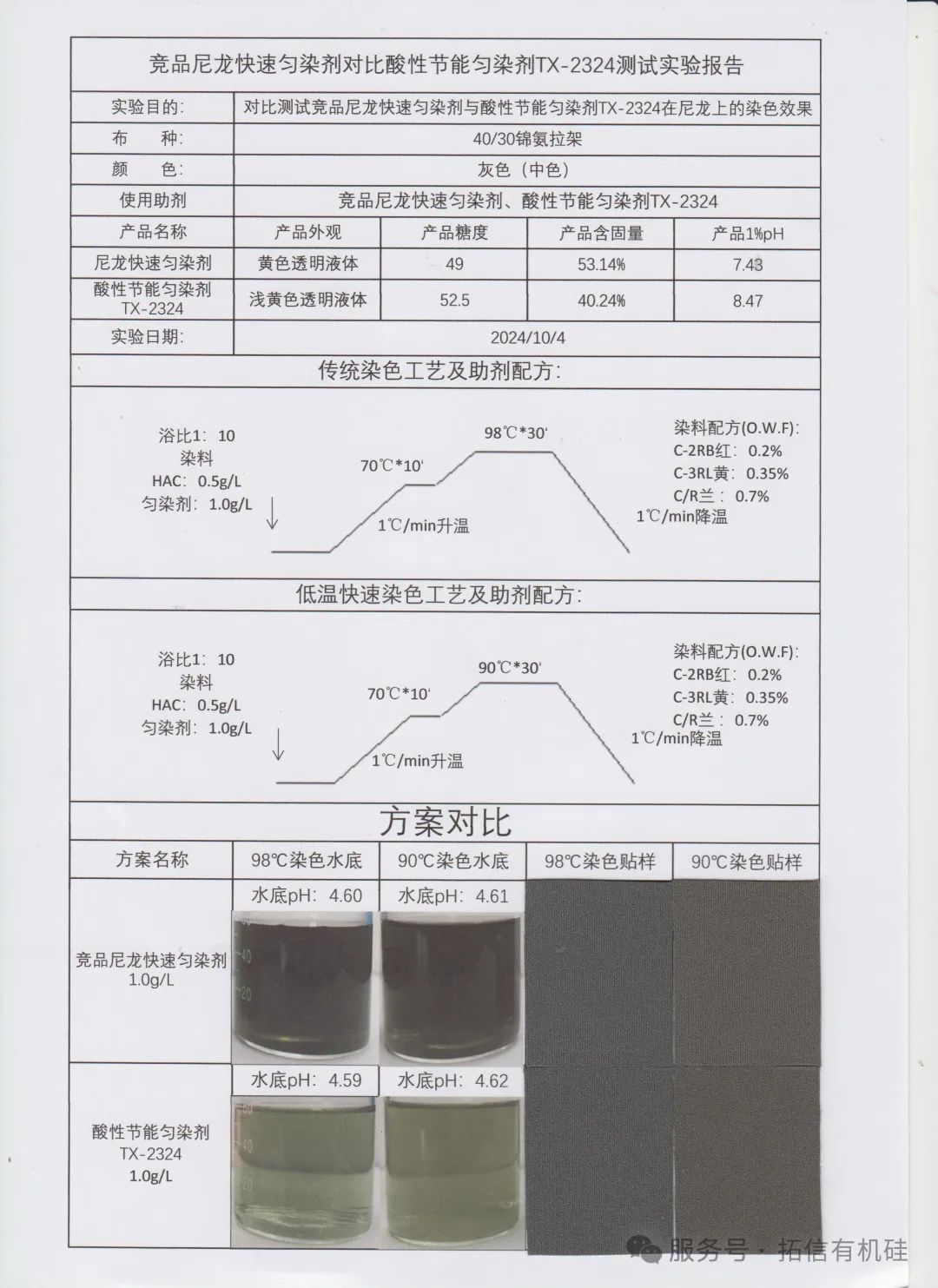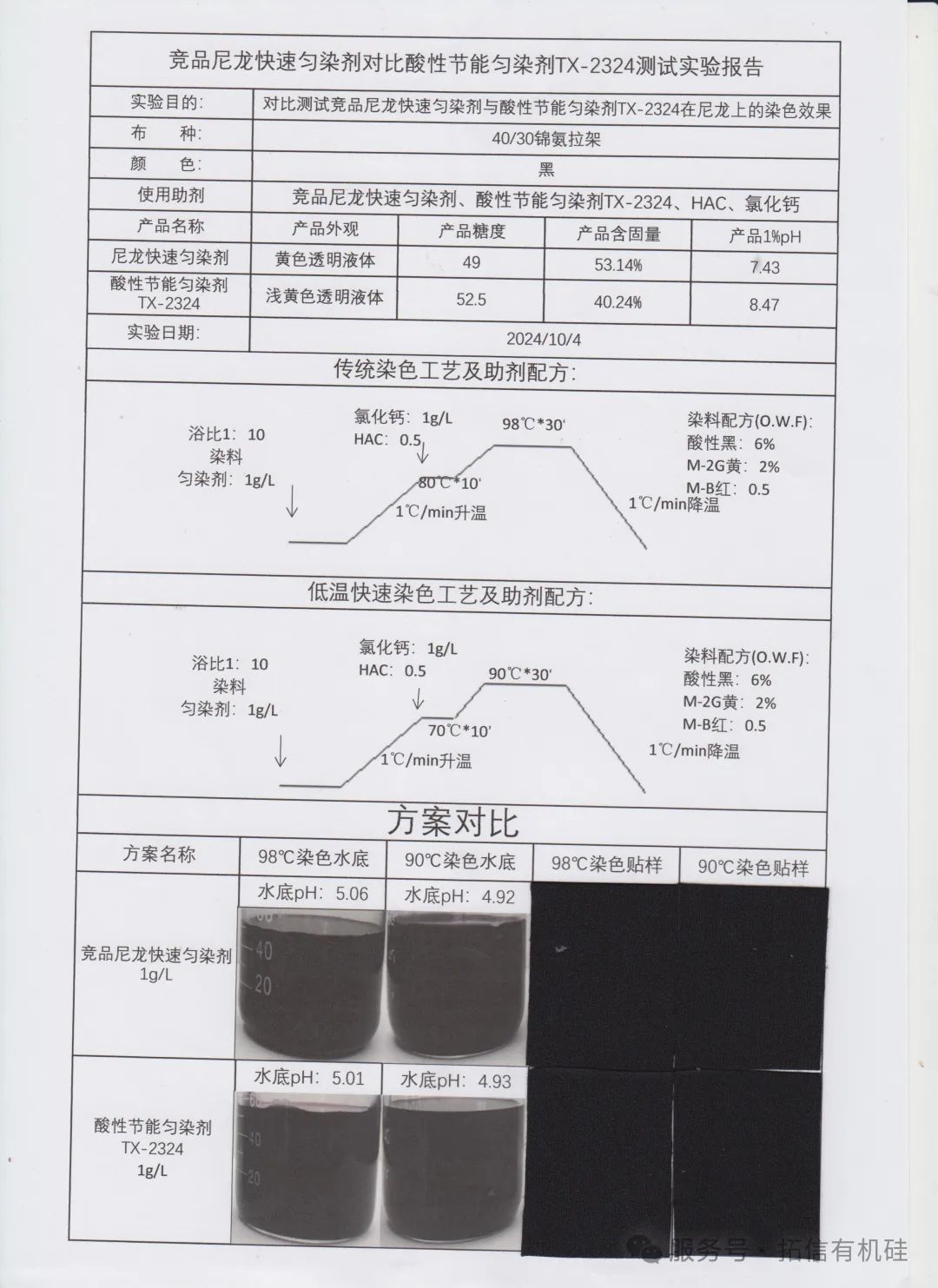 常规匀染剂要在 98 度以上得色率才会高,拓信酸性节能匀染剂TX-2324 能够适应各种酸性染料,特殊的结构使染色时染料和纤维均匀结合,90℃时就有很好的上色效果,色牢度同 98 度染色效果一样,对染色条件适应性广泛。
